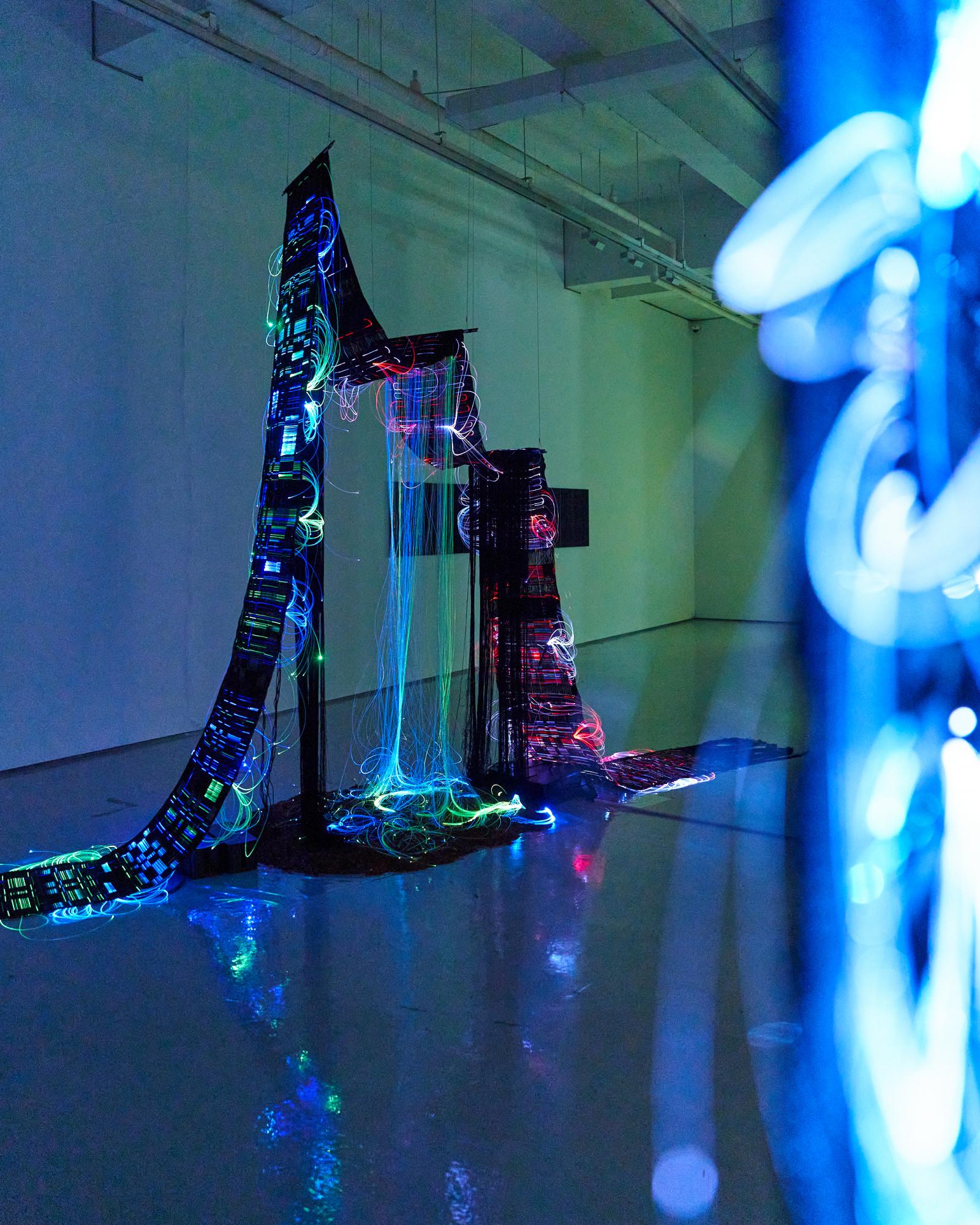 The exhibition explores the intersection of digital and analog, translating forgotten sounds of time and space into woven forms that merge color, light, and memory.