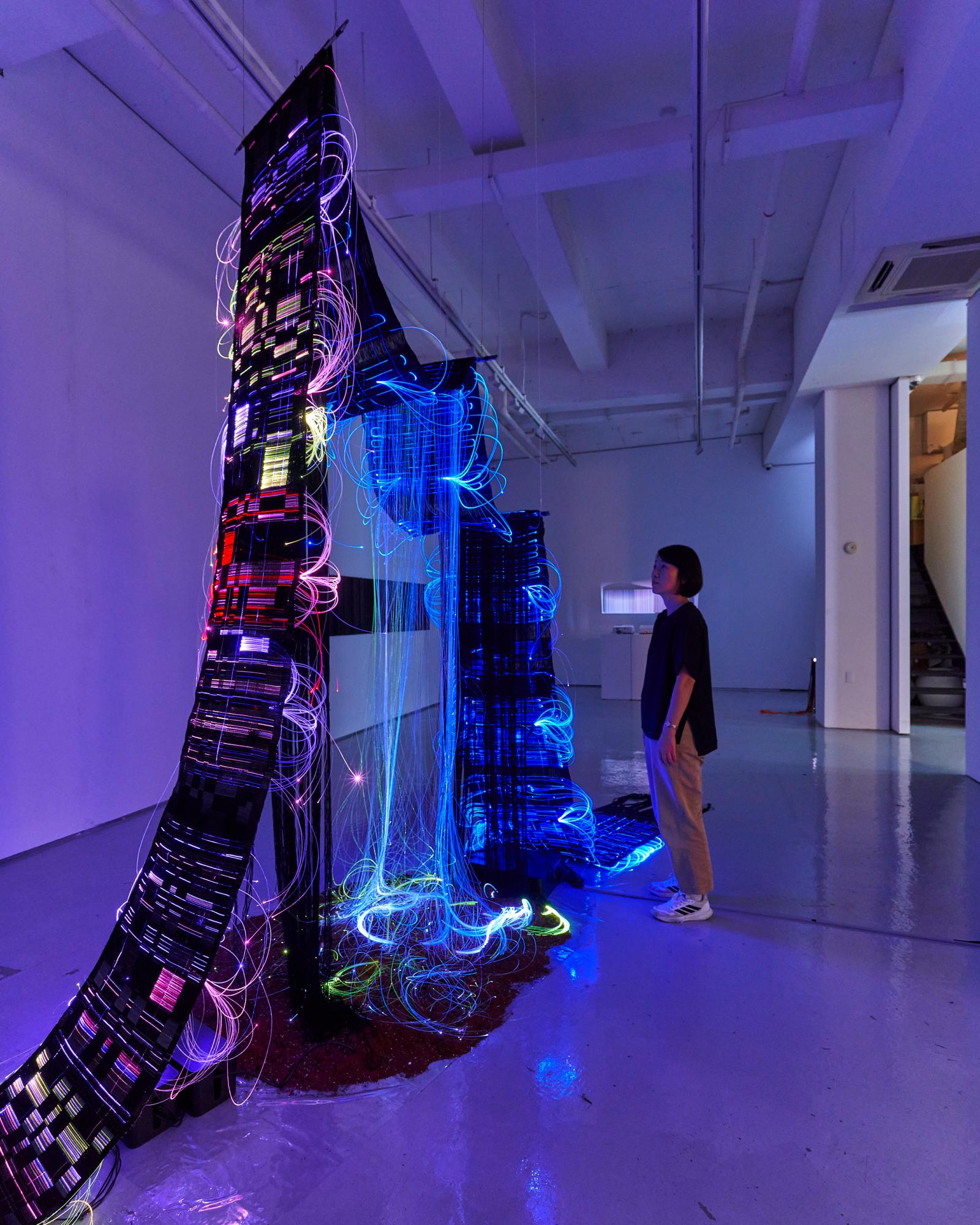 The interactive textile sculpture <Memory, Algorithm, Signal_From the Earth> connects viewers’ heartbeats to luminous woven forms, symbolizing how earth and digital signals intertwine across time. <Sound–Color Spectrum> series and <Well and Thread Clue> guide viewers into infinite extensions of color and line, reflecting on memory, desire, and awakening.